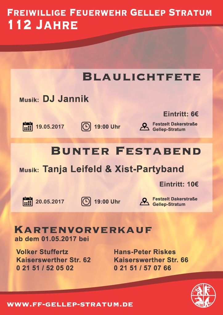 Anlässlich des Jubiläumsjahres, welches in Anlehnung an die Notrufnummer 112 gefeiert wird, lädt die Löschgruppe in dieser Woche zu ihren Festveranstaltungen ein:Zum Auftakt der Feierlichkeiten öffnet am Freitag, 19.05.2017 das Festzelt an der Dakerstraße für Jung und Alt ab 19:00 Uhr. Auf der großen Blaulichtfete spielt DJ Jannik an diesem Abend die besten Hits der 80er, 90er, 2000er und der aktuellen Charts. Eintrittskarten können zum Preis von 6,00 € erworben werden.